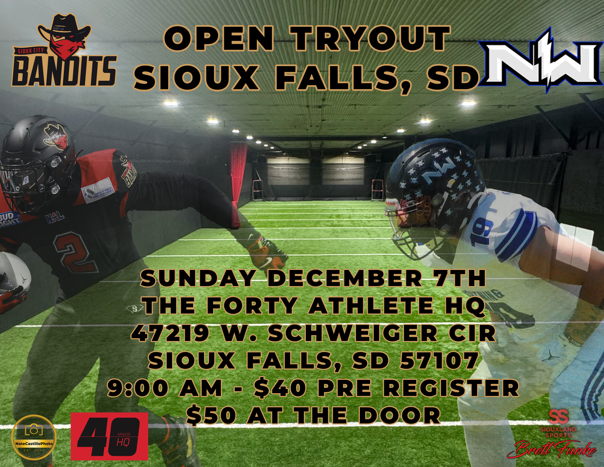 The Sioux City Bandits and Northwest Iowa Lightning are teaming up for a joint tryout in Sioux Falls, SD. This combine-style workout gives athletes the chance to earn a professional paid contract with the Bandits, or develop their skills and gain valuable game film with the Lightning, a semi-professional team based in Sioux Center, Iowa.